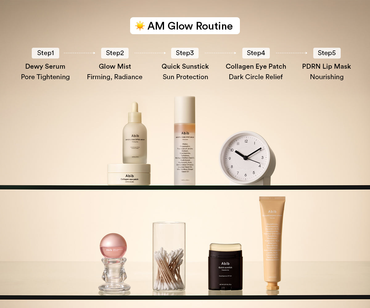 Start your morning fresh with a 5-minute glow routine—apply a firming serum, brighten with cream, and swipe on a quick sun stick for effortless radiance. Finish with the Glazed Jelly Lip Mask for a hydrated, makeup-ready glow that lasts all day.